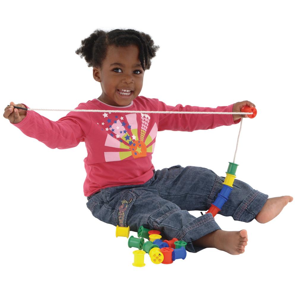 Set of 20 cotton reels in 4 bright colours plus a chunky threading cord. Ideal for threading and stacking to encourage hand/eye coordination and manual dexterity. Made from tough, durable plastic.