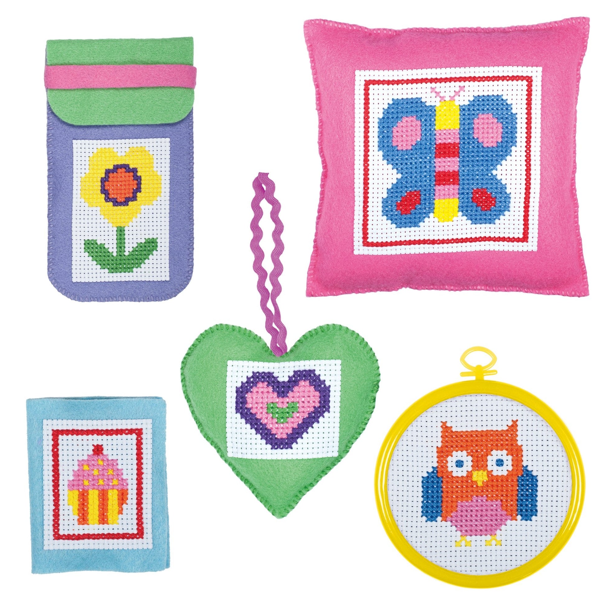 Create a butterfly cushion, owl picture, scented heart, flower pencil case and cupcake needle book. Simply cross stitch the picture, matching the coloured thread to the coloured sections on the fabric. An ideal introduction to cross stitch in a cool suitcase!