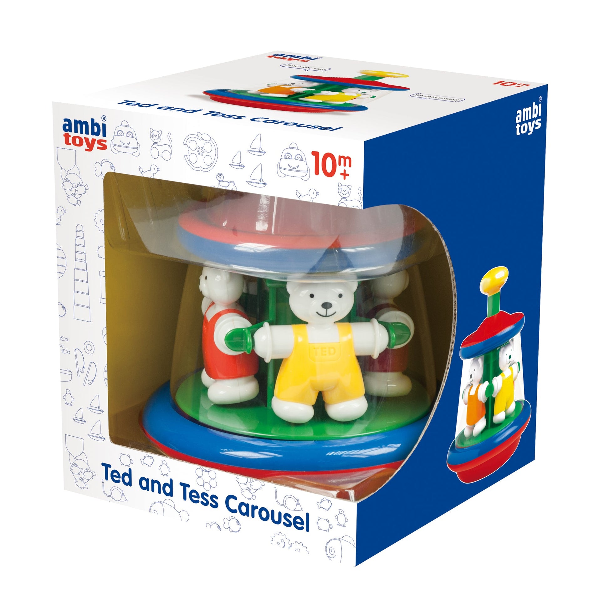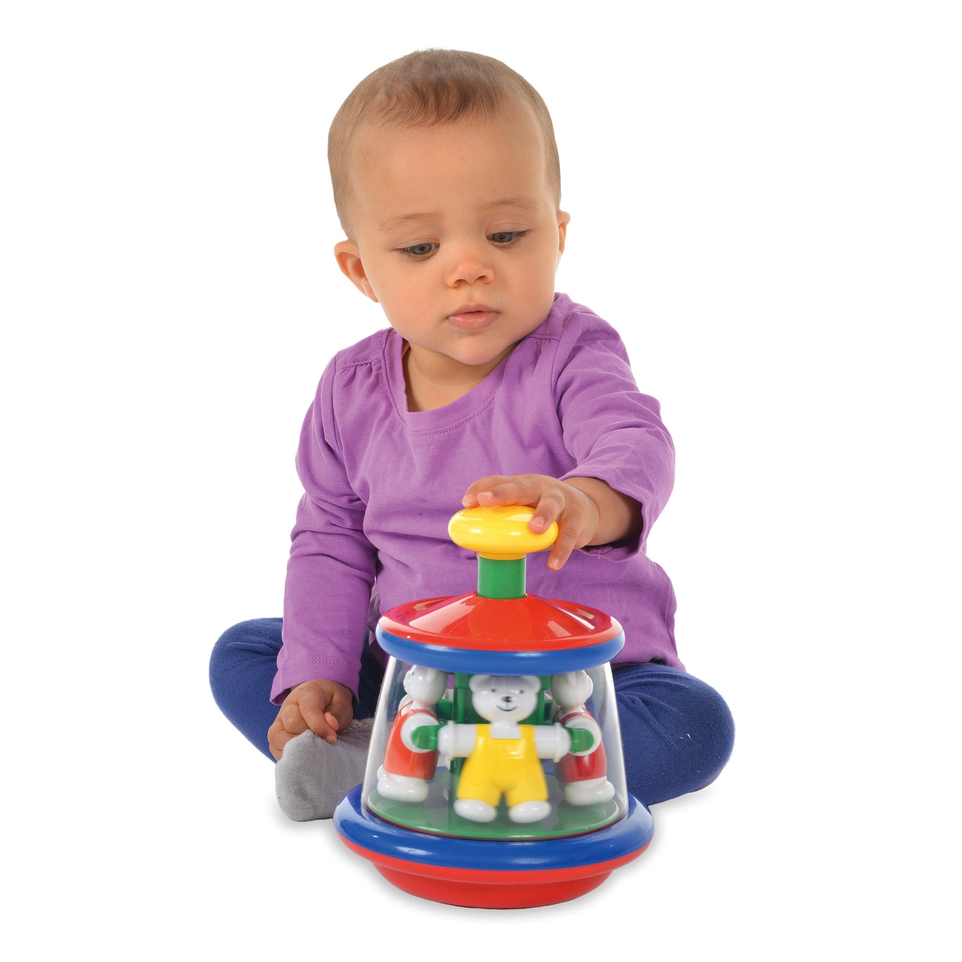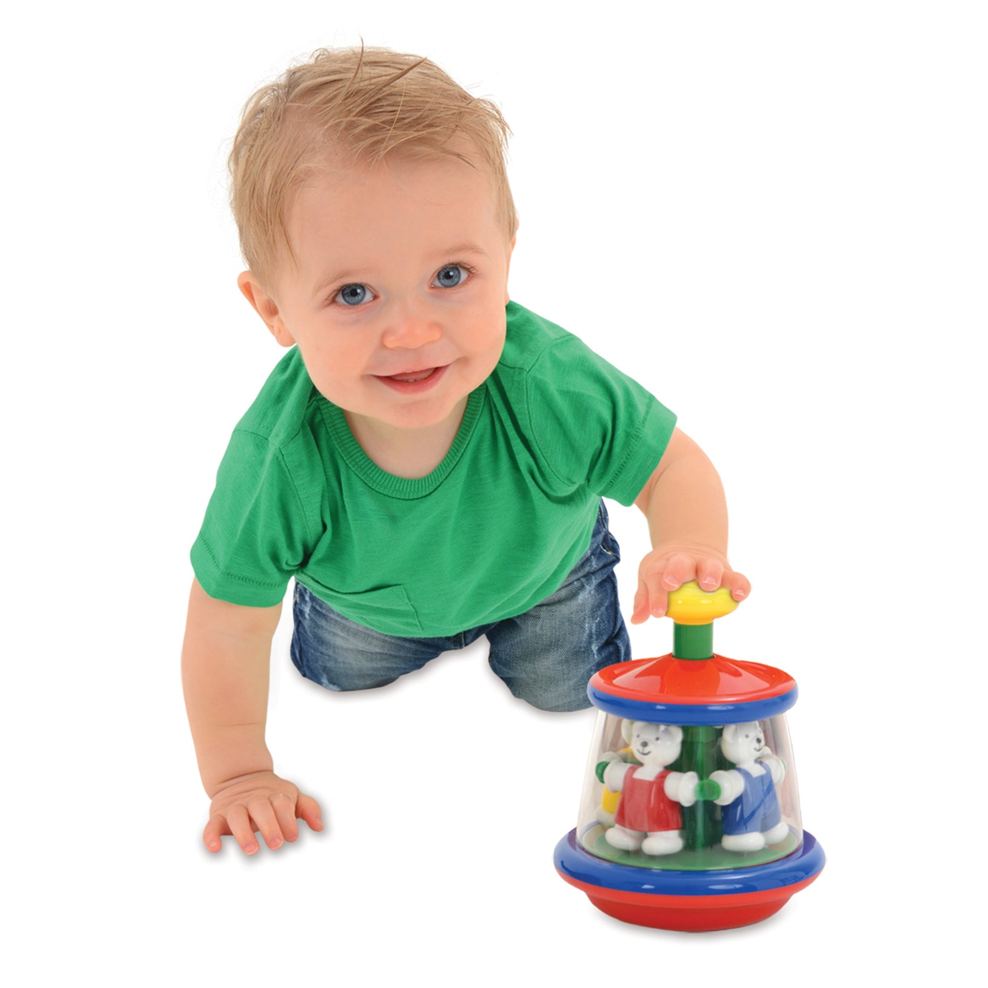 The gentlest pressure on the big yellow top makes this carousel of teddies spin around merrily showing cause and effect and encouraging endless repetition.Awarded 'Approved' status by the Good Toy Guide. Height 19.5cm